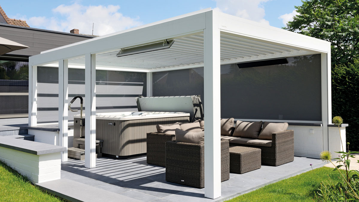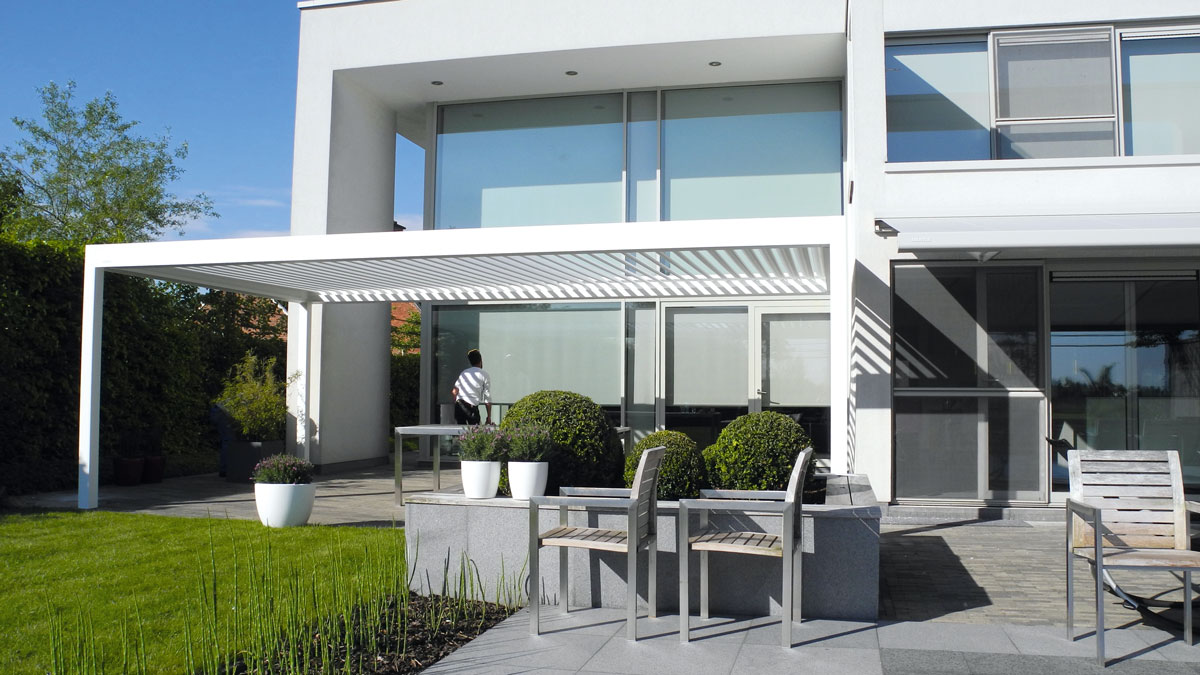 Mit den vollautomatisch beweglichen Alulamellen dosieren Sie detailliert das Sonnenlicht. 4 verbundene Rinnen führen das Regenwasser unauffällig über die Seitenpfosten ab. Eingebaute Screens, eventuell mit durchsichtigen Fenstern, gewährleisten ein echtes Terrassengefühl, während ein optionales Heizelement eine angenehme Strahlungswärme verbreitet. Eine optionale LED Beleuchtung gibt dem Ganzen eine besondere Atmosphäre.